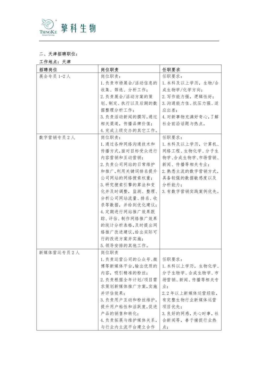 天津擎科生物技术有限公司招聘简章