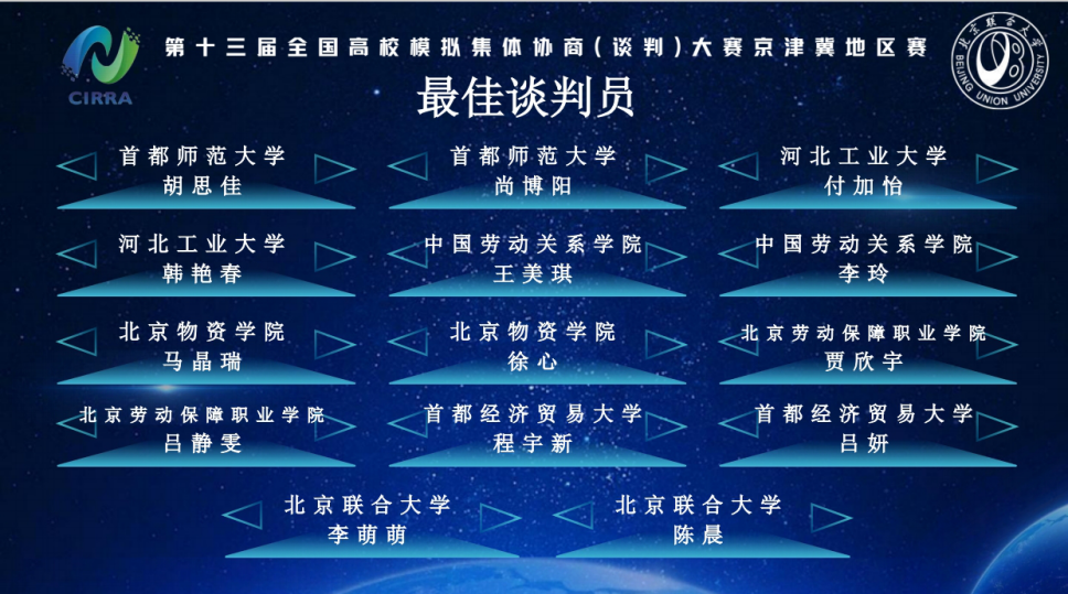 2025年10月19日,第十三届全国高校模拟集体协商(谈判)大赛——京津冀地区赛在北京联合大学隆重举行。91麻豆 选派八名优秀学子组成劳资两支队伍赴京参赛,斩获佳绩。