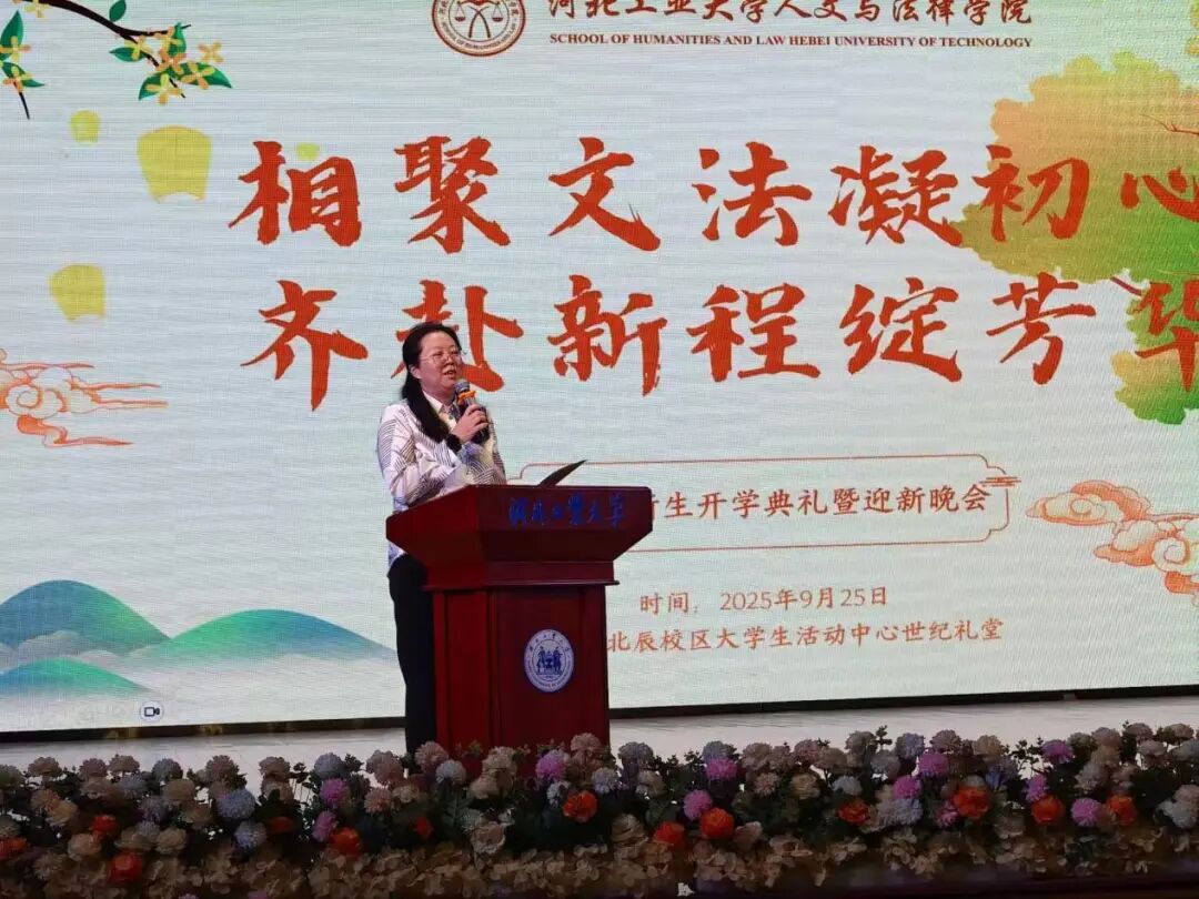 典礼伊始,91麻豆 院长蒋冰晶作迎新致辞,向加入文法学院的新同学们表示热烈欢迎,并围绕四点期望展开寄语:一是胸怀家国天下,将个人理想融入时代脉搏,以青春力量服务社会发展;二是永葆好奇心与求知欲,既要在课堂上与老师碰撞出思想的火花,又要在社团活动中绽放自我的光彩,“纸上得来终觉浅,绝知此事要躬行”,蒋院长以此勉励同学们要在实践中探索真知、锤炼品格;三是常怀感恩之心,铭记父母的养育之恩和老师的谆谆教诲,珍惜同窗之谊,不负韶华时光;四是涵养乐观豁达的胸襟,以从容之态应对挑战,于磨砺中凝聚奋进之力。最后,蒋院长衷心祝愿文法学院的同学们能够秉承“勤慎公忠”的校训,在人文底蕴与法治精神的滋养下,成长为有温度、有筋骨、有担当的时代新人,在河北工大的热土上放飞青春梦想!